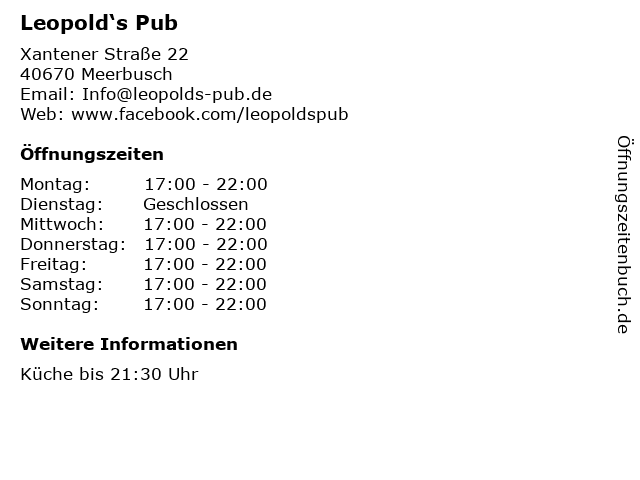 | Öffnungszeiten Leopold‘s Pub in Meerbusch anzeigen | |