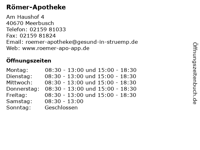 | Öffnungszeiten Römer-Apotheke in Meerbusch anzeigen | |