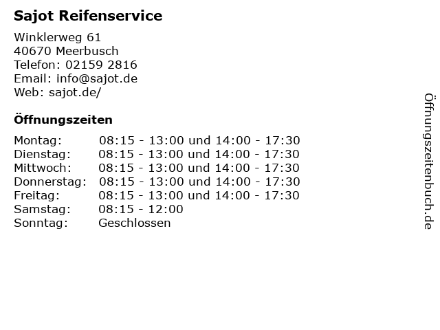 | Öffnungszeiten Sajot Reifenservice in Meerbusch anzeigen | |