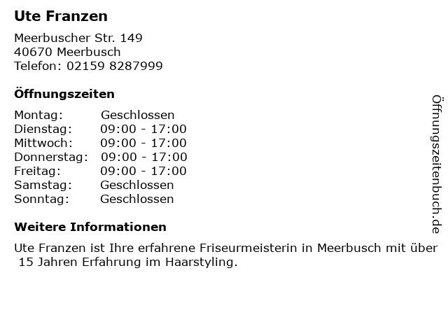 | Öffnungszeiten Ute Franzen in Meerbusch anzeigen | |