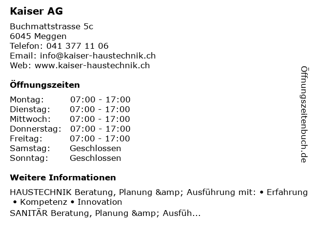 | Öffnungszeiten Kaiser AG in Meggen anzeigen | |