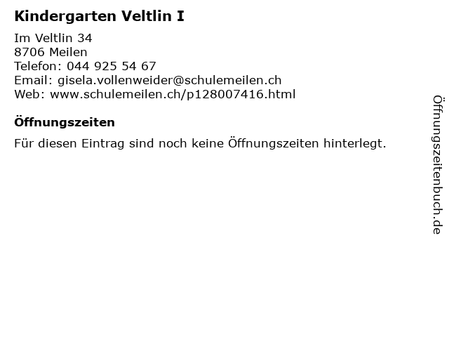 | Öffnungszeiten Kindergarten Veltlin I in Meilen anzeigen | |