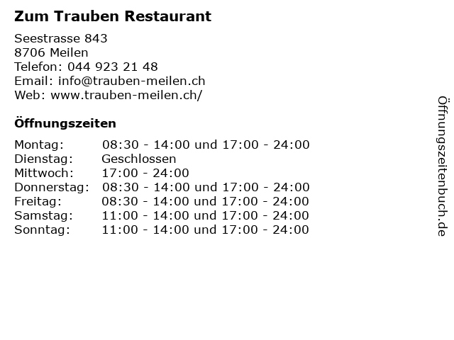 | Öffnungszeiten Zum Trauben Restaurant in Meilen anzeigen | |