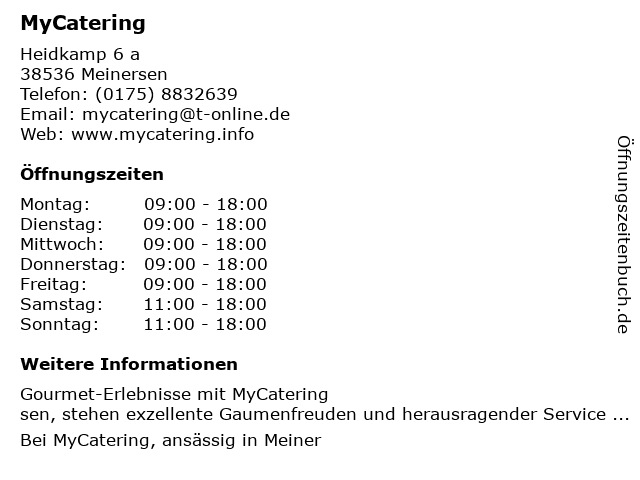 | Öffnungszeiten MyCatering in Meinersen anzeigen | |