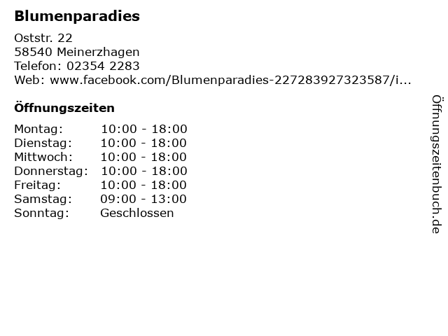 | Öffnungszeiten Blumenparadies in Meinerzhagen anzeigen | |