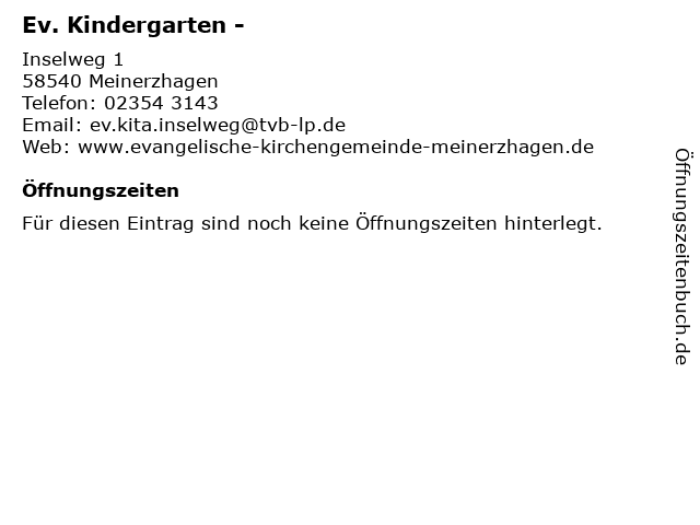 | Öffnungszeiten Ev. Kindergarten - in Meinerzhagen anzeigen | |