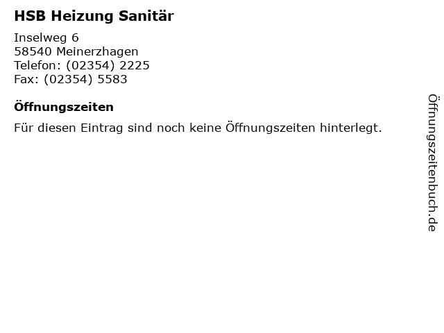 | Öffnungszeiten HSB Heizung Sanitär in Meinerzhagen anzeigen | |