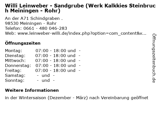Branchen & Suchbegriffe zu Willi Leinweber - Sandgrube (Werk Kalkkies Steinbruch Meiningen - Rohr):kalkkies, leinweber, rohr, sandgrube, steinbruch, werk, willi |