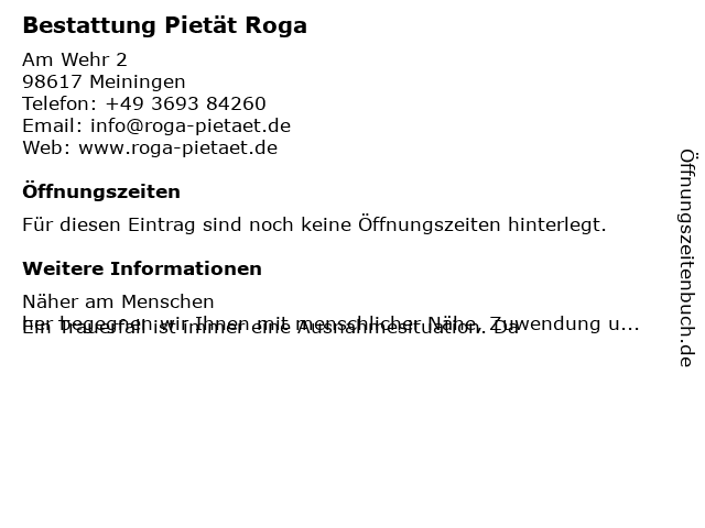 | Öffnungszeiten Bestattung Pietät Roga in Meiningen anzeigen | |