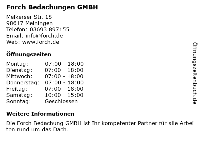 | Öffnungszeiten Forch Bedachungen GMBH in Meiningen anzeigen | |