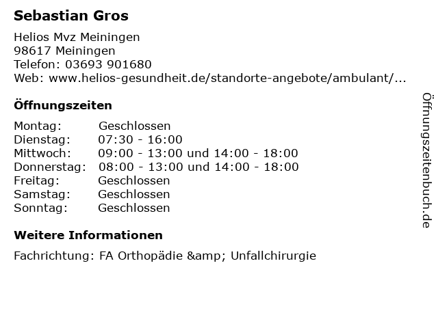 | Öffnungszeiten Sebastian Gros in Meiningen anzeigen | |