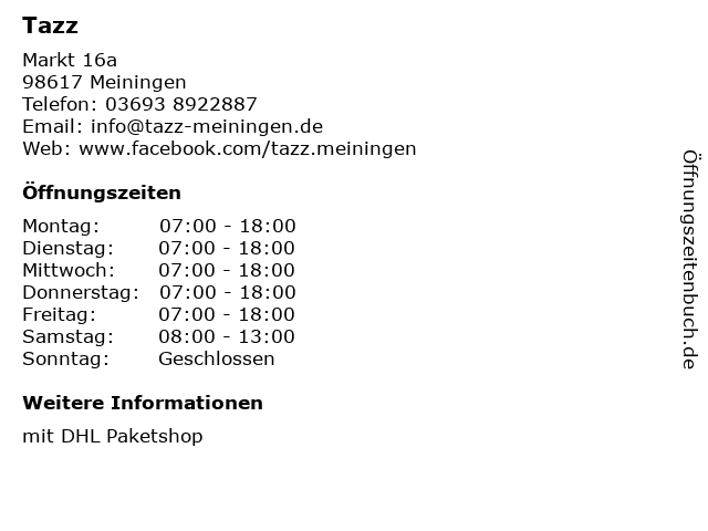 | Öffnungszeiten Tazz in Meiningen anzeigen | |