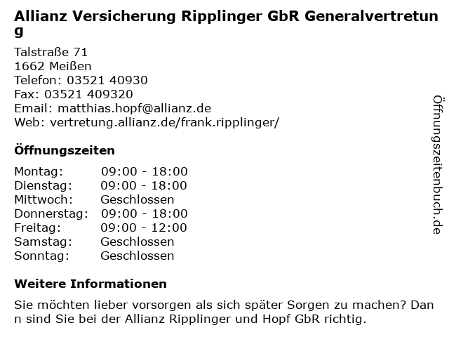 1 Allianz Versicherung Ripplinger GbR Generalvertretung (Entfernung: 15,67 km) Freiberger Straße 17, 01683 Nossen 2 Allianz Versicherung Udo Jendrossek Generalvertretung (Entfernung: 0,00 km) Talstraße 71, 01662 Meißen 3 Allianz Versicherung Lutz Hoffmann Generalvertretung (Entfernung: 1,55 km) Gerbergasse 4, 01662 Meißen 4 Allianz Versicherung Ronny Geidelt Generalvertretung (Entfernung: 2,64 km) Großenhainer Straße 57, 01662 Meißen 6 |