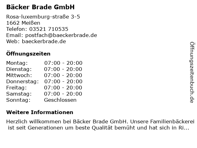 | Öffnungszeiten Bäcker Brade GmbH in Meißen anzeigen | |