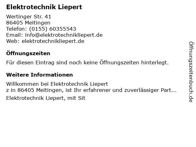 | Öffnungszeiten Elektrotechnik Liepert in Meitingen anzeigen | |