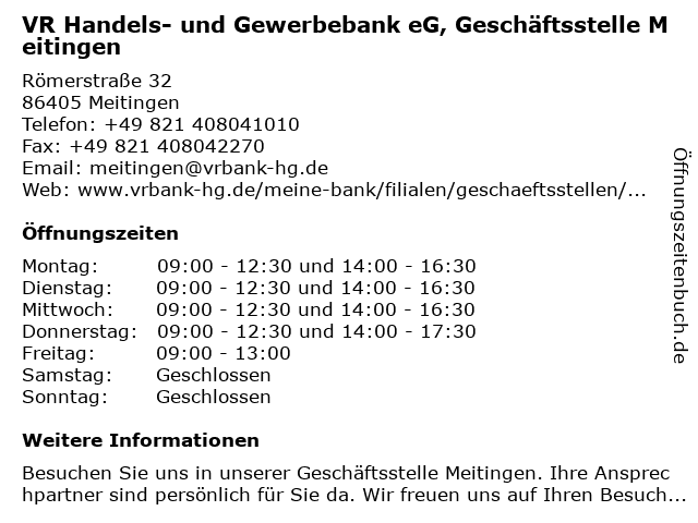 3 VR-Bank Handels-und Gewerbebank eG (Geldautomat) (Entfernung: 1,61 km) Klemensstr. 25, 86405 Meitingen 4 5 VR-Bank Handels-und Gewerbebank eG (Geldautomat) (Entfernung: 4,77 km) Marktplatz 3, 86672 Thierhaupten 6 |