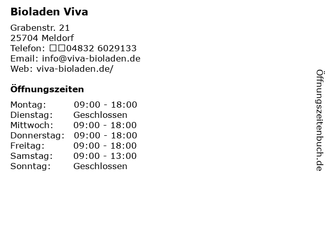 | Öffnungszeiten Bioladen Viva in Meldorf anzeigen | |