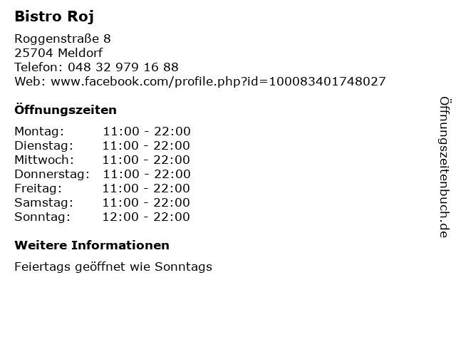 | Öffnungszeiten Bistro Roj in Meldorf anzeigen | |