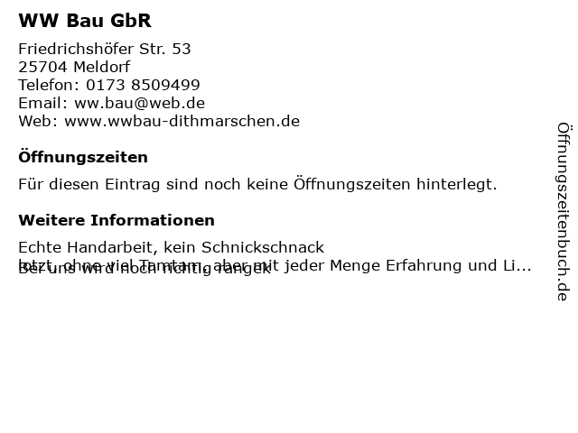 | Öffnungszeiten WW Bau GbR in Meldorf anzeigen | |