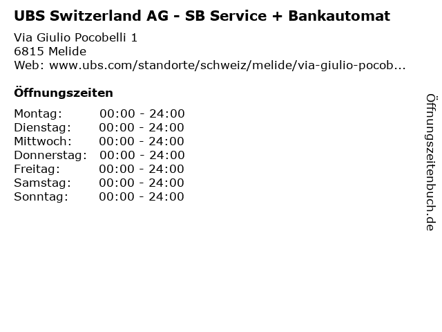 | Öffnungszeiten UBS Switzerland AG - SB Service + Bankautomat in Melide anzeigen | |