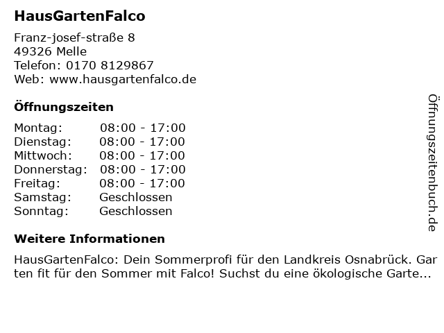 | Öffnungszeiten HausGartenFalco in Melle anzeigen | |