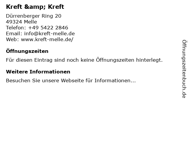 | Öffnungszeiten Kreft & Kreft in Melle anzeigen | |