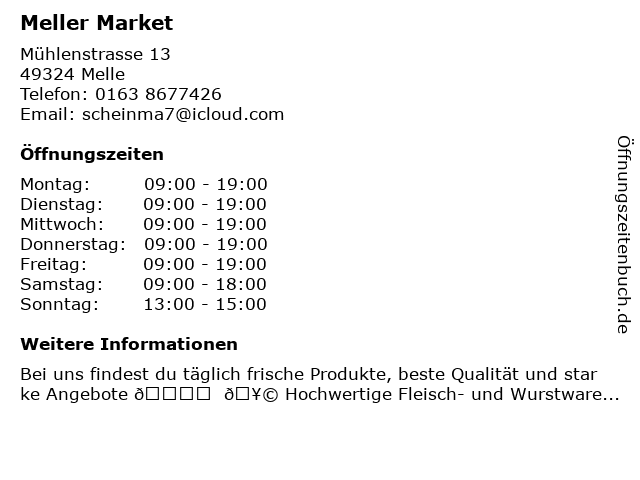 | Öffnungszeiten Meller Market in Melle anzeigen | |