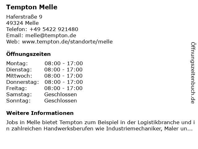 | Öffnungszeiten Tempton Melle in Melle anzeigen | |