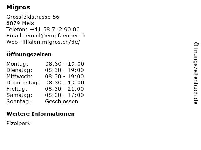 | Öffnungszeiten Migros in Mels anzeigen | |