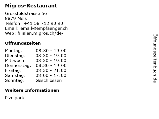 | Öffnungszeiten Migros-Restaurant in Mels anzeigen | |