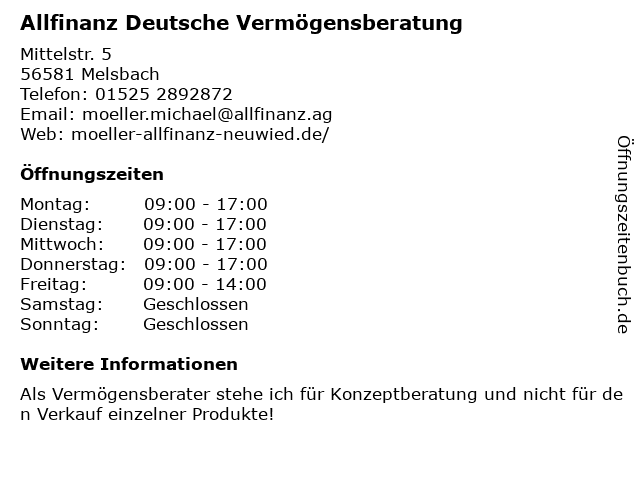 2 Svenja Sittinger Agentur für Allfinanz Deutsche Vermögensberatung (Entfernung: 0,63 km) Am Goldberg 17 a, 56581 Melsbach 4 Schell Brigitte Deutsche Vermögensberatung Finanzdienstleistungen (Entfernung: 6,40 km) Im Felster 36 A, 56567 Neuwied 5 Deutsche Vermögensberatung - Stefan Schreiber (Entfernung: 6,53 km) Heddesdorfer Str. 14, 56564 Neuwied 6 Klaus Ueberhorst Deutsche Vermögensberatung (Entfernung: 6,55 km) Heddesdorfer Str. 14, 56564 Neuwied |