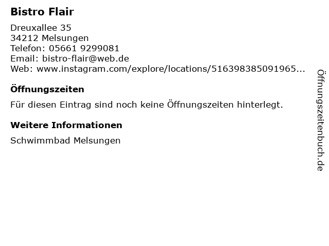 | Öffnungszeiten Bistro Flair in Melsungen anzeigen | |
