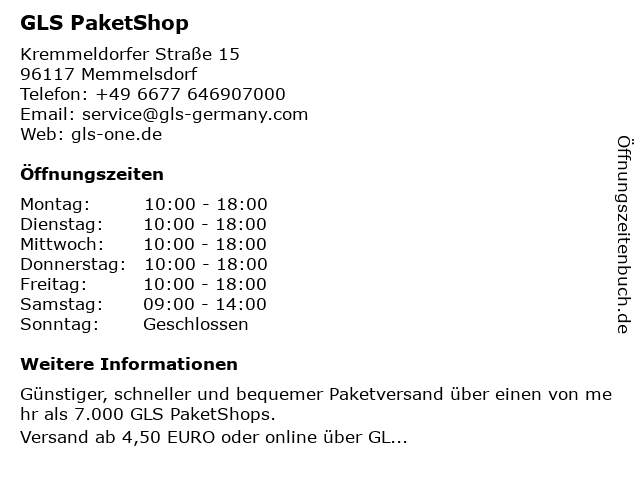 | Öffnungszeiten GLS PaketShop in Memmelsdorf anzeigen | |