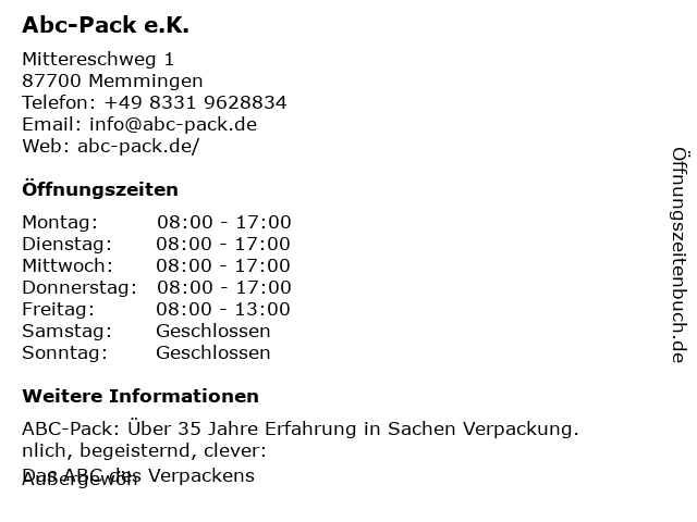 | Öffnungszeiten Abc-Pack e.K. in Memmingen anzeigen | |