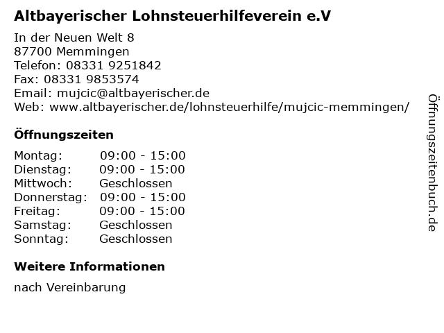 1 Lohnsteuerhilfeverein Vereinigte Lohnsteuerhilfe e.V. - GESCHLOSSEN (Entfernung: 1,61 km) Kramerstr. 13, 87700 Memmingen 2 Lohnsteuerberatungsverbund e. V. -Lohnsteuerhilfeverein- Beratungsstelle Memmingen (Entfernung: 1,76 km) Freudenthalstraße 23, 87700 Memmingen 3 Lohnsteuerhilfeverein Vereinigte Lohnsteuerhilfe e.V. - Geschlossen (Entfernung: 2,20 km) Brandenburger Str. 1, 87700 Memmingen 4 Lohnsteuerberatungsverbund e. V. -Lohnsteuerhilfeverein- Beratungsstelle Memmingerberg (Entfernung: 3,11 km) Am Flughafen 12, 87766 Memmingerberg 6 Lohnsteuerhilfeverein HILO e.V. - Beratungsstellenleiter Peter Neubauer (Entfernung: 8,68 km) Schloßblick 9, 87748 Fellheim |