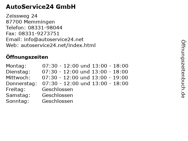 | Öffnungszeiten AutoService24 GmbH in Memmingen anzeigen | |