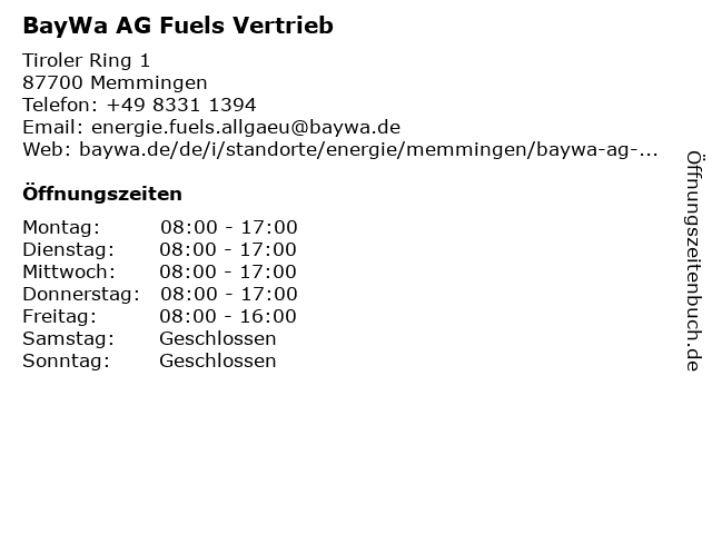| Öffnungszeiten BayWa AG Fuels Vertrieb in Memmingen anzeigen | |