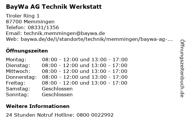 | Öffnungszeiten BayWa AG Technik Werkstatt in Memmingen anzeigen | |
