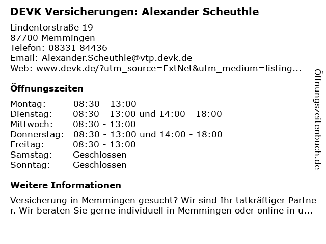 3 DEVK Versicherungen: Vanessa Jusmann (Berater*in ausgeschieden) (Entfernung: 0,00 km) Lindentorstraße 19, 87700 Memmingen 6 DEVK Versicherungen: Egon Sauter (Berater*in ausgeschieden) (Entfernung: 0,01 km) Lindentorstraße 19, 87700 Memmingen |