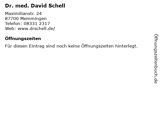 | Öffnungszeiten Dr. med. David Schell in Memmingen anzeigen | |
