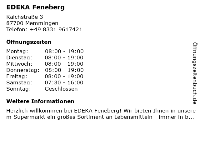 | Öffnungszeiten EDEKA Feneberg in Memmingen anzeigen | |