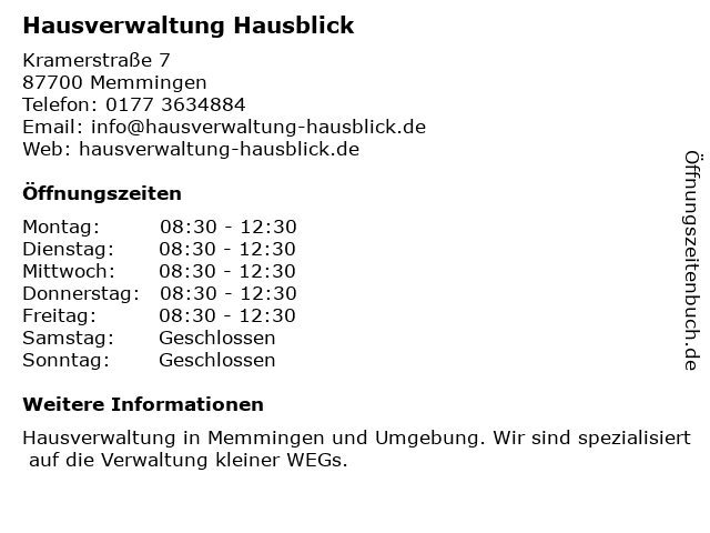 | Öffnungszeiten Hausverwaltung Hausblick in Memmingen anzeigen | |