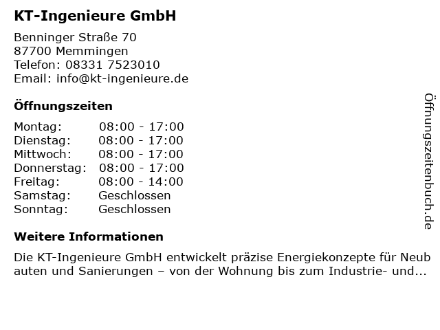 | Öffnungszeiten KT-Ingenieure GmbH in Memmingen anzeigen | |