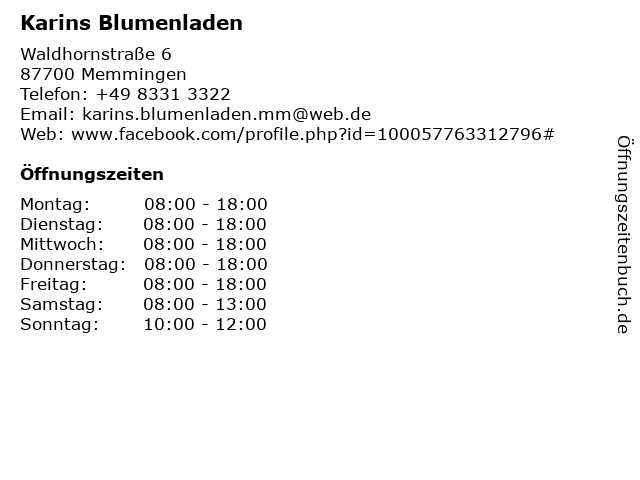 | Öffnungszeiten Karins Blumenladen in Memmingen anzeigen | |