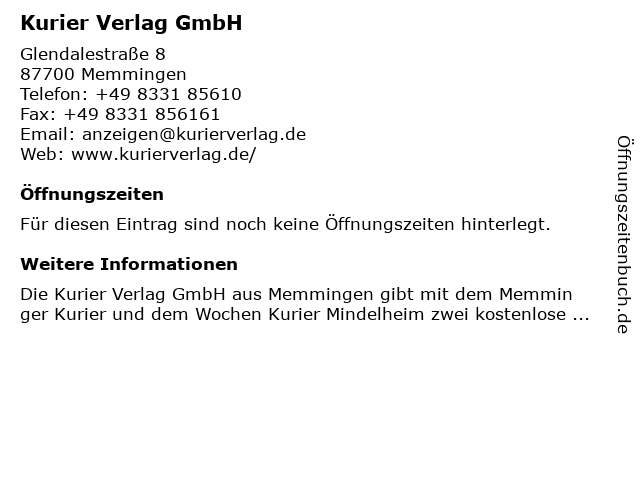 | Öffnungszeiten Kurier Verlag GmbH in Memmingen anzeigen | |