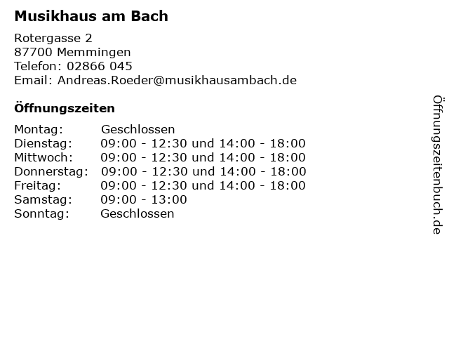 | Öffnungszeiten Musikhaus am Bach in Memmingen anzeigen | |