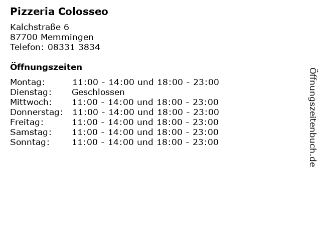 | Öffnungszeiten Pizzeria Colosseo in Memmingen anzeigen | |