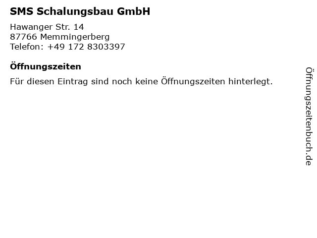 | Öffnungszeiten SMS Schalungsbau GmbH in Memmingerberg anzeigen | |