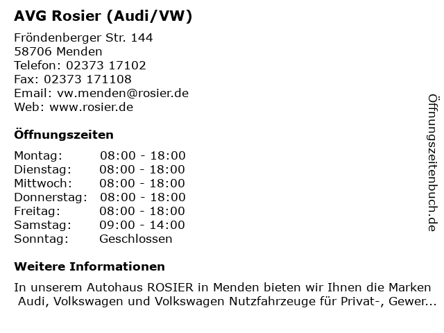 | Öffnungszeiten AVG Rosier (Audi/VW) in Menden anzeigen | |