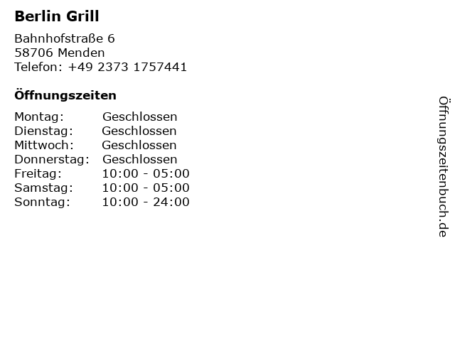 | Öffnungszeiten Berlin Grill in Menden anzeigen | |